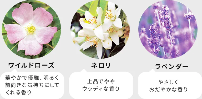 ワイルドローズ、ネロリ、ラベンダーの天然精油※を独自の配合でブレンド。華やかさとやすらぎに満ちた香りでスキンケアをするたび、前向きな気持ちに。