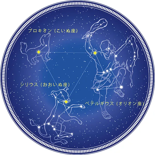 3つの星を結ぶ: ベテルギウス、シリウス、プロキオンの3つの星を結ぶと、大きな三角形ができます。