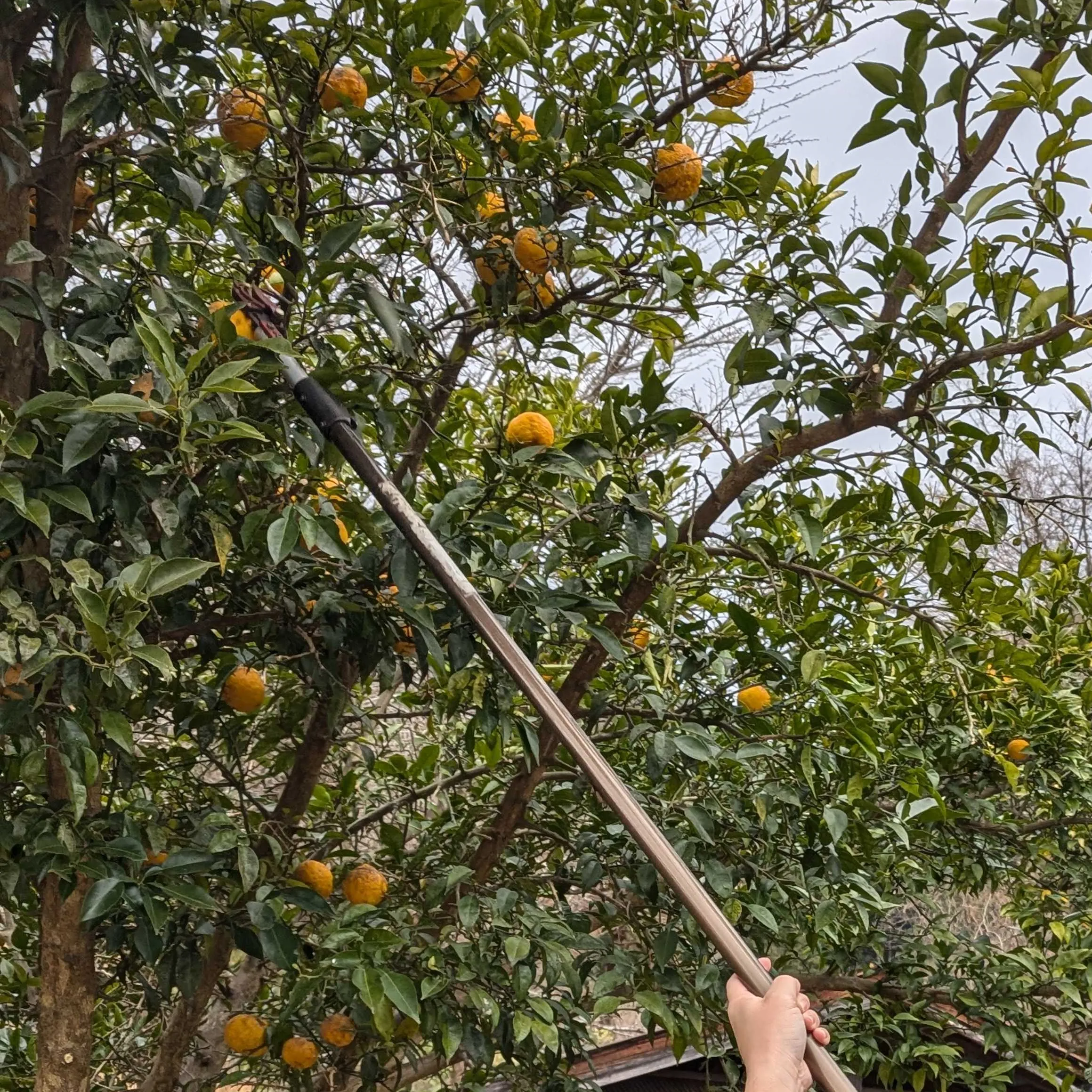悪戦苦闘のゆずの収穫。高枝ばさみでも届かないくらいの場所に。
