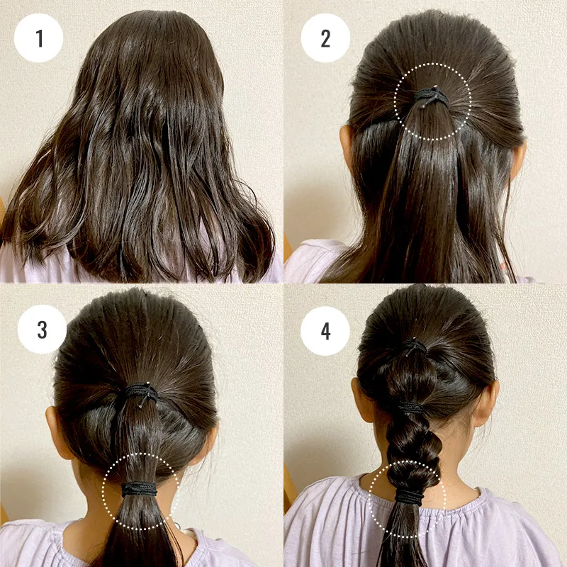 ②ハーフアップにします。耳のあたりで結ぶとお団子の位置が下にきて、帽子をかぶりやすくなります。