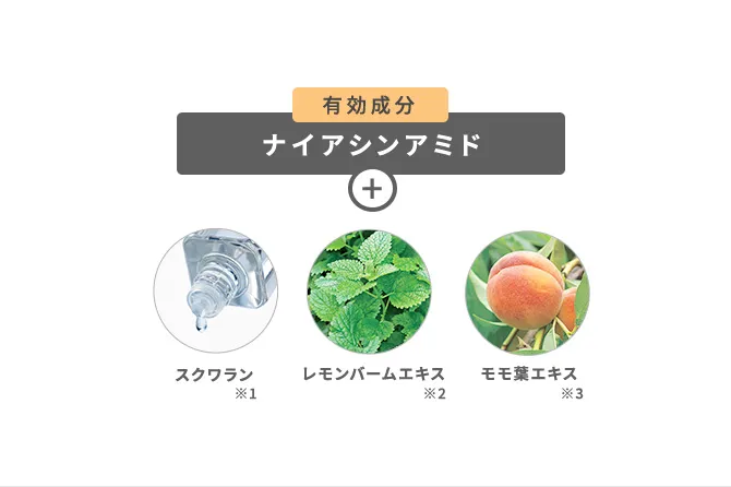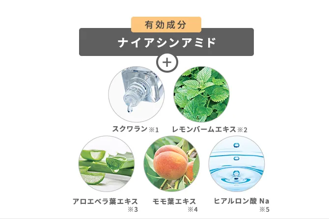 ※ ナイアシンアミド:有効成分、水素添加大豆リン脂質:保湿成分、シュガースクワラン:保湿成分