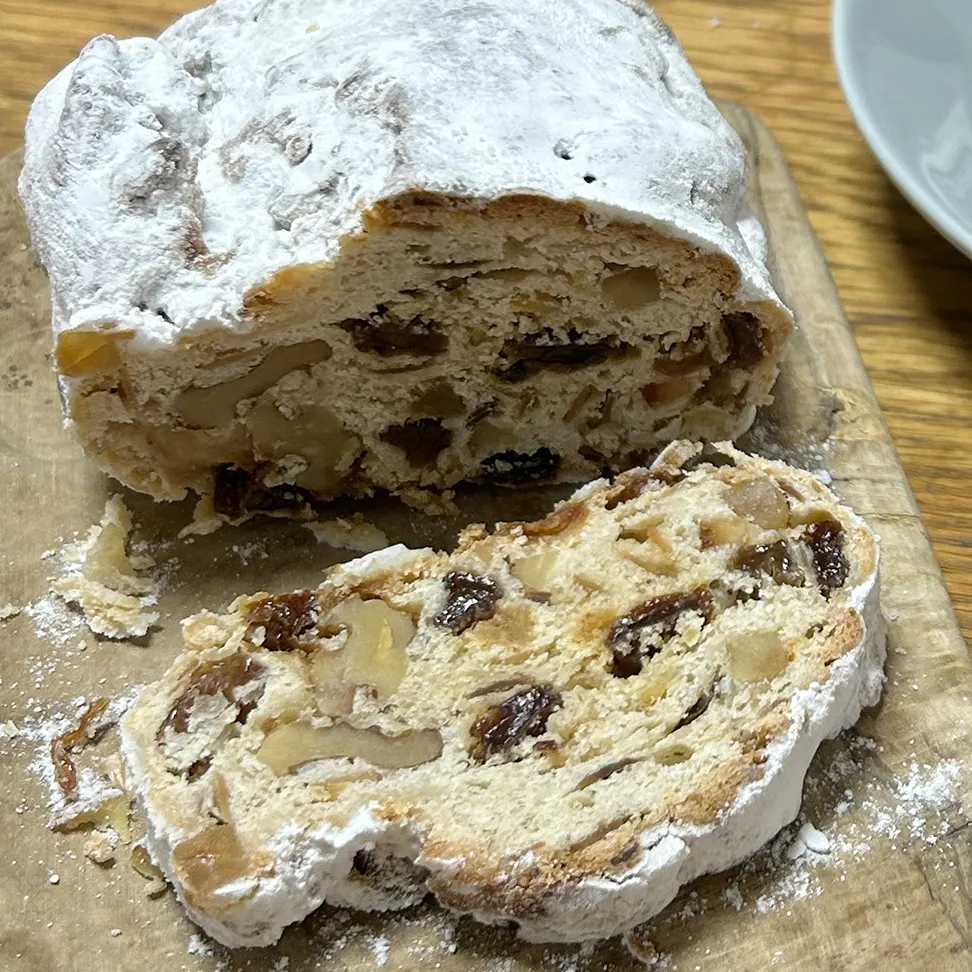 ラム酒に漬けたドライフルーツやナッツがたっぷり入った発酵生地を焼き、表面を粉砂糖で覆った、ずしりとした甘いパンのようなケーキです。 クリスマスまで少しずつスライスして味を育てながら楽しみます。日に日に風味が深まるのも魅力で、最近は日本でもクリスマスの定番になりつつあります。ただしカロリー爆弾。