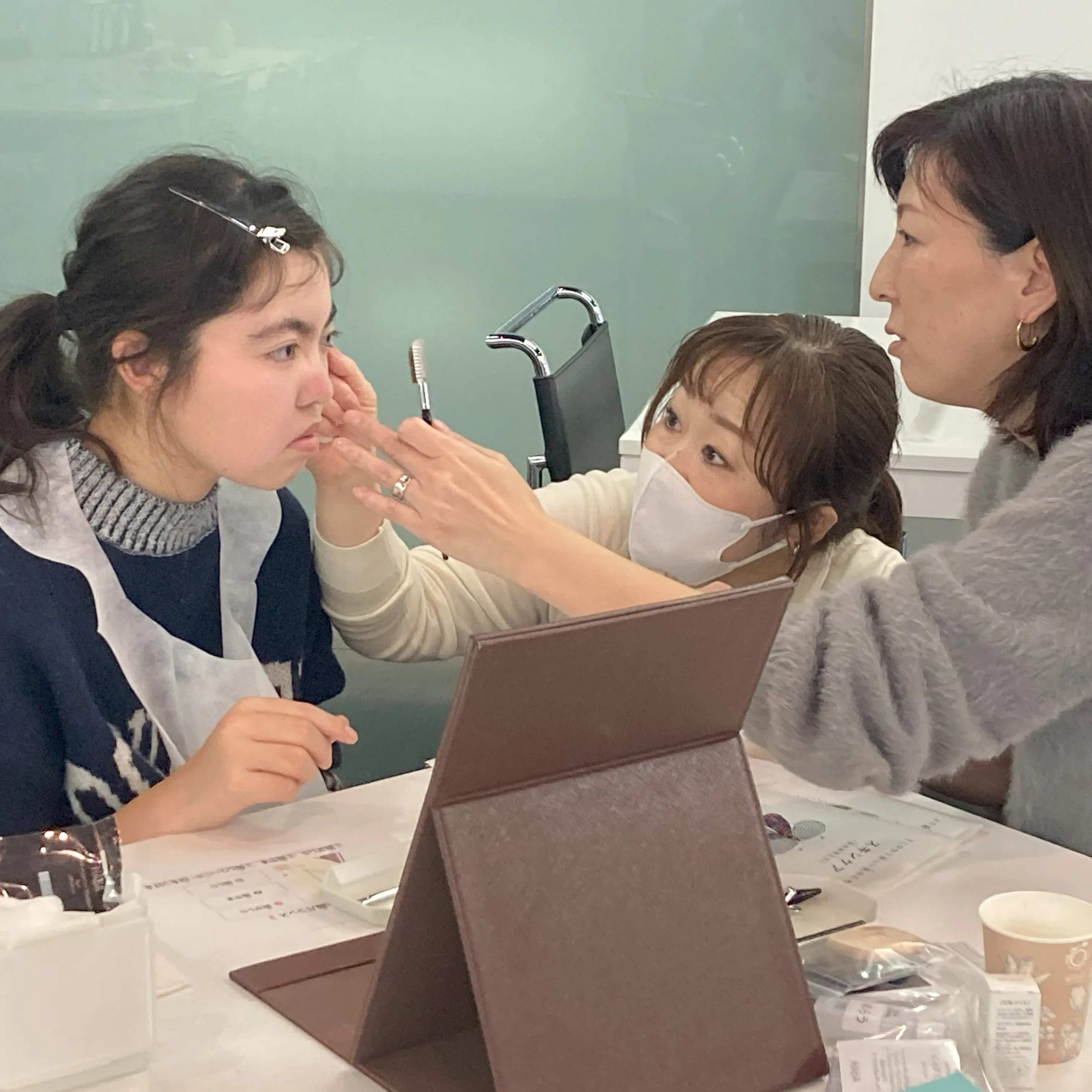 参加者の障害の様子も多様。その人の特性に合わせて、手を添えてつける位置を示したり、筆談を用いたり。いかに分かりやすく伝えるかの試行錯誤は、美容スタッフにとってもスキルアップにつながっています。
