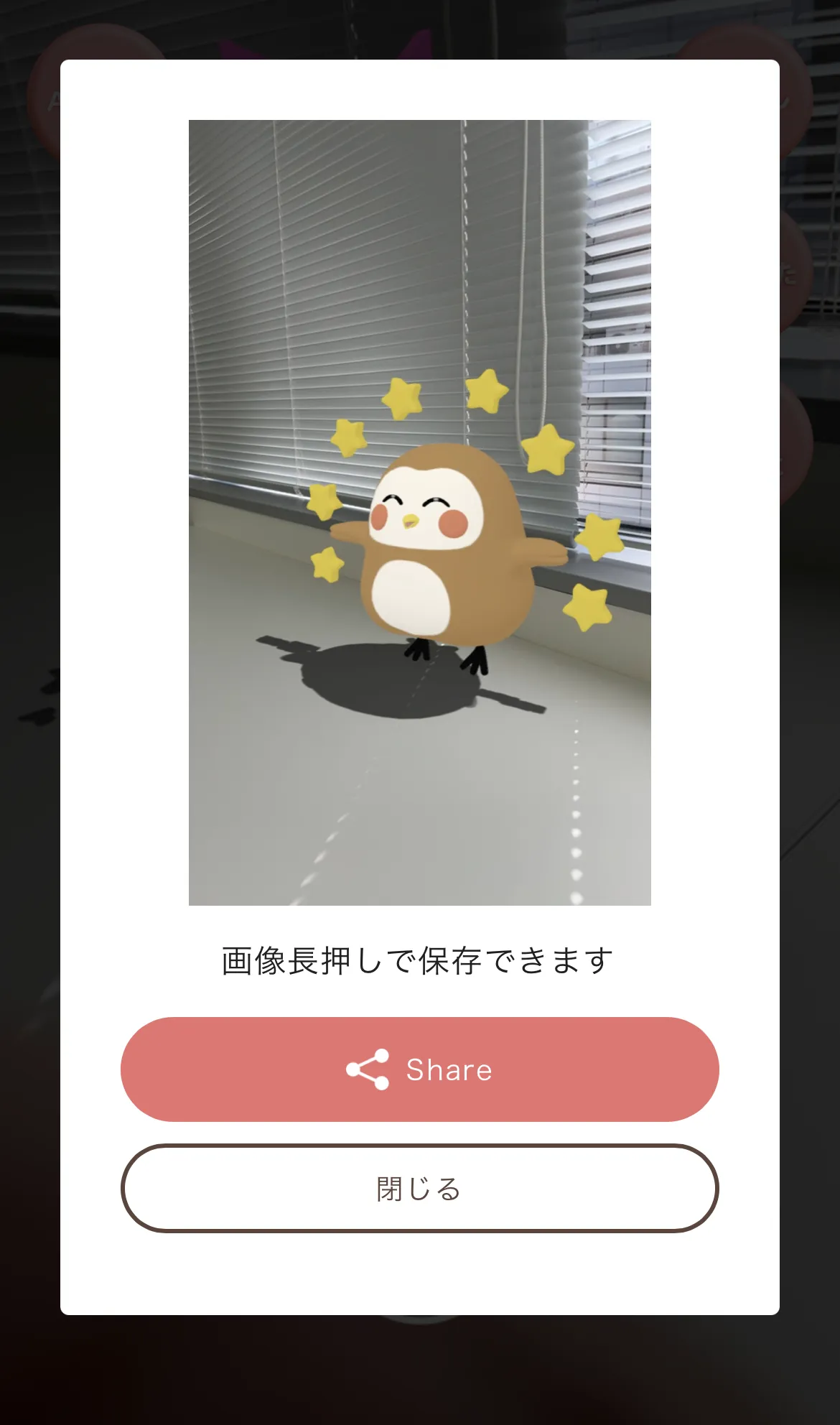 ⑪撮影したサムネイル画像を長押しするか、「share」→「画像を保存」をタップで撮影画像を保存することができます。
