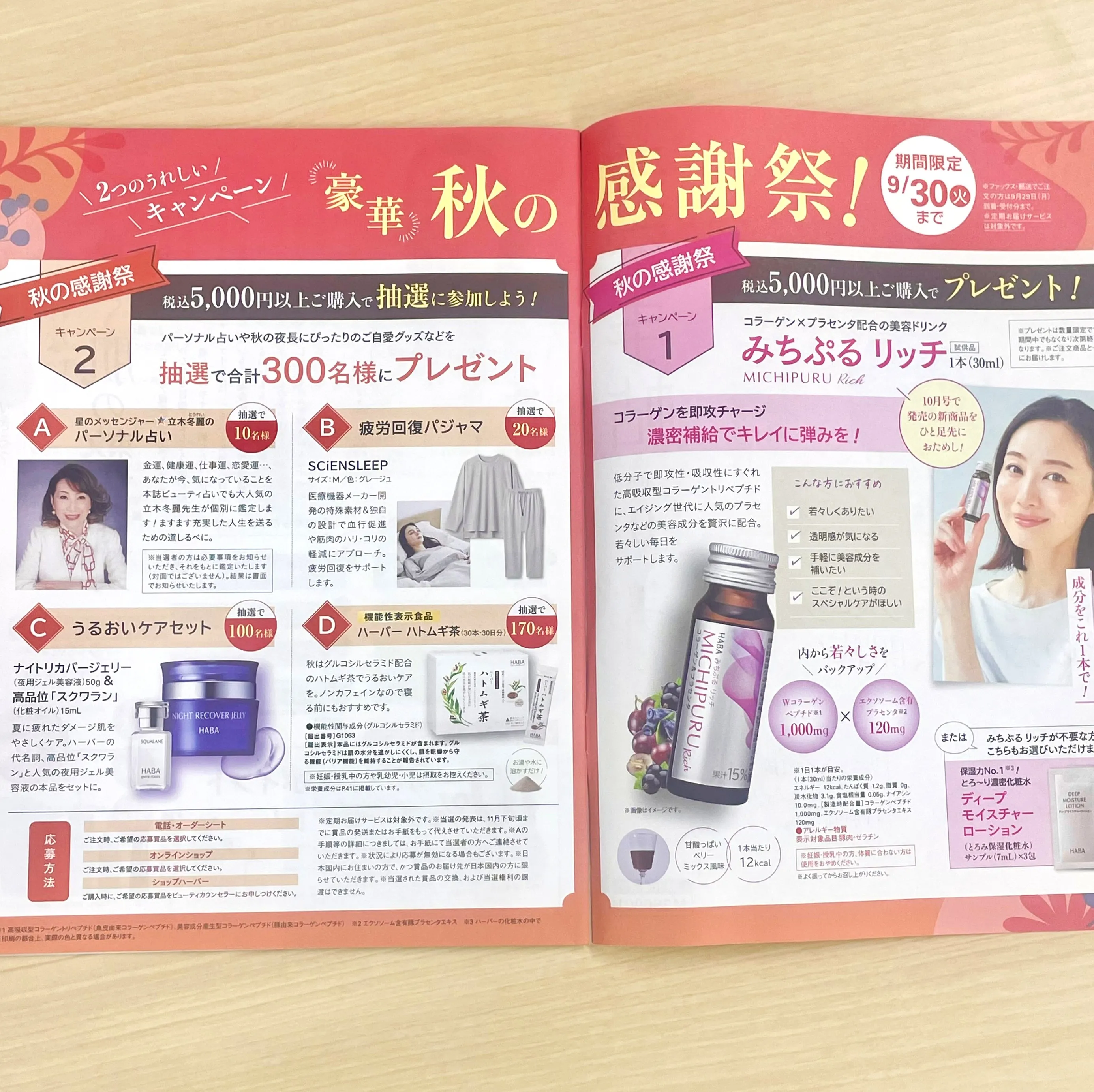 税込5,000円以上ご購入で美容ドリンク「みちぷる リッチ」*をプレゼント!コラーゲン✖プラセンタ配合の「みちぷる リッチ」は10月号から発売の新商品。このキャンペーンでひと足先におためしできちゃいます♪