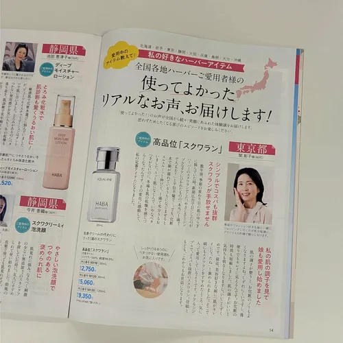 スクワランをご愛用の関様。取材のため初めてお会いした瞬間!驚くほど透き通った肌に感激しました。ずーっと高品位「スクワラン」をお使い頂けていると聞いてまたうれしくなりました。さらに娘さんもご愛用頂けているそうです。うれしいです。