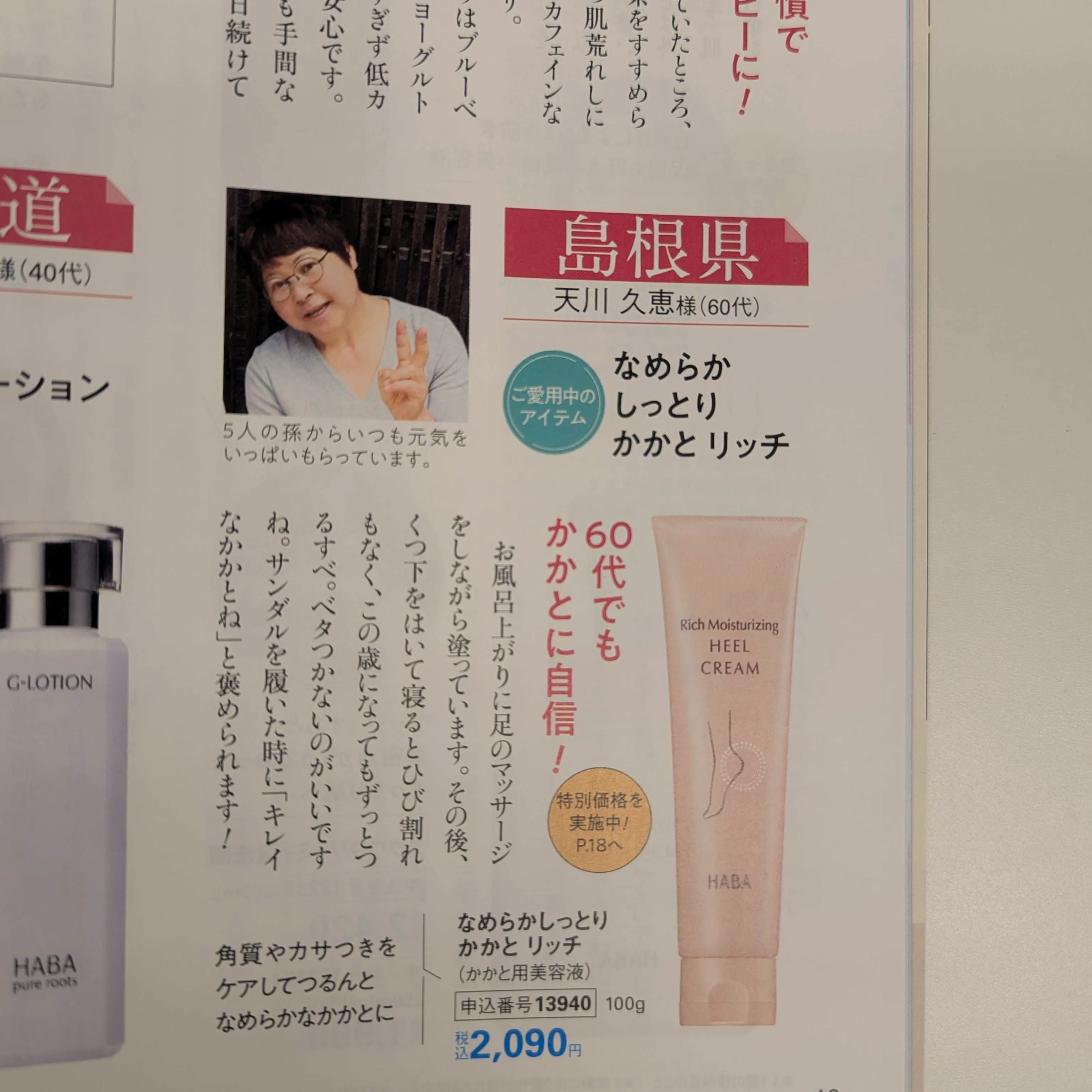 5人のお孫さんがいらっしゃる、おばあちゃんなんだそうです。お風呂上りのかかとのケアは欠かさないそうです。なめらかしっとりかかとリッチの良い所を聞いてみると、ベタベタしない使用感がとっても良いとのこと。60代でも、かかとがまだまだキレイになれると喜んでいらっしゃいました。